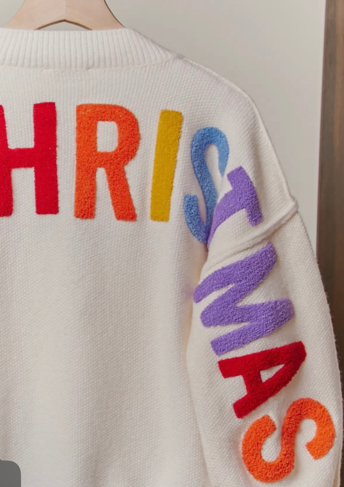 Cream sweater with multicolored Ho Ho Ho and Merry Christmas writing!