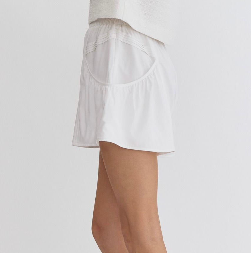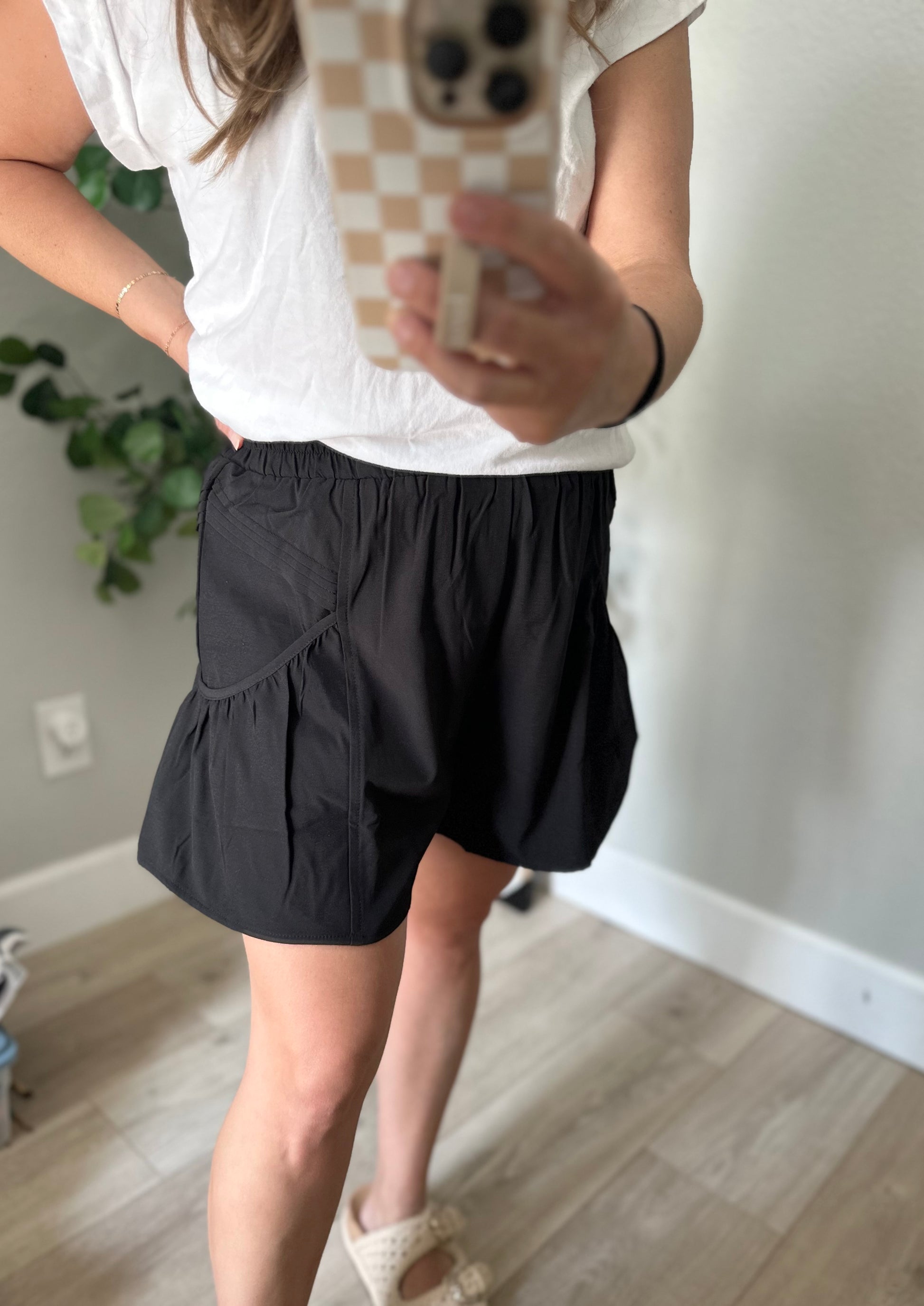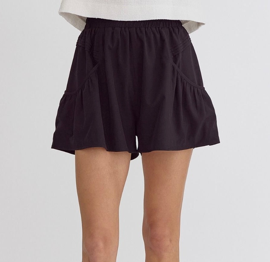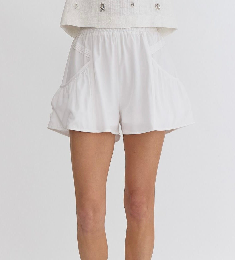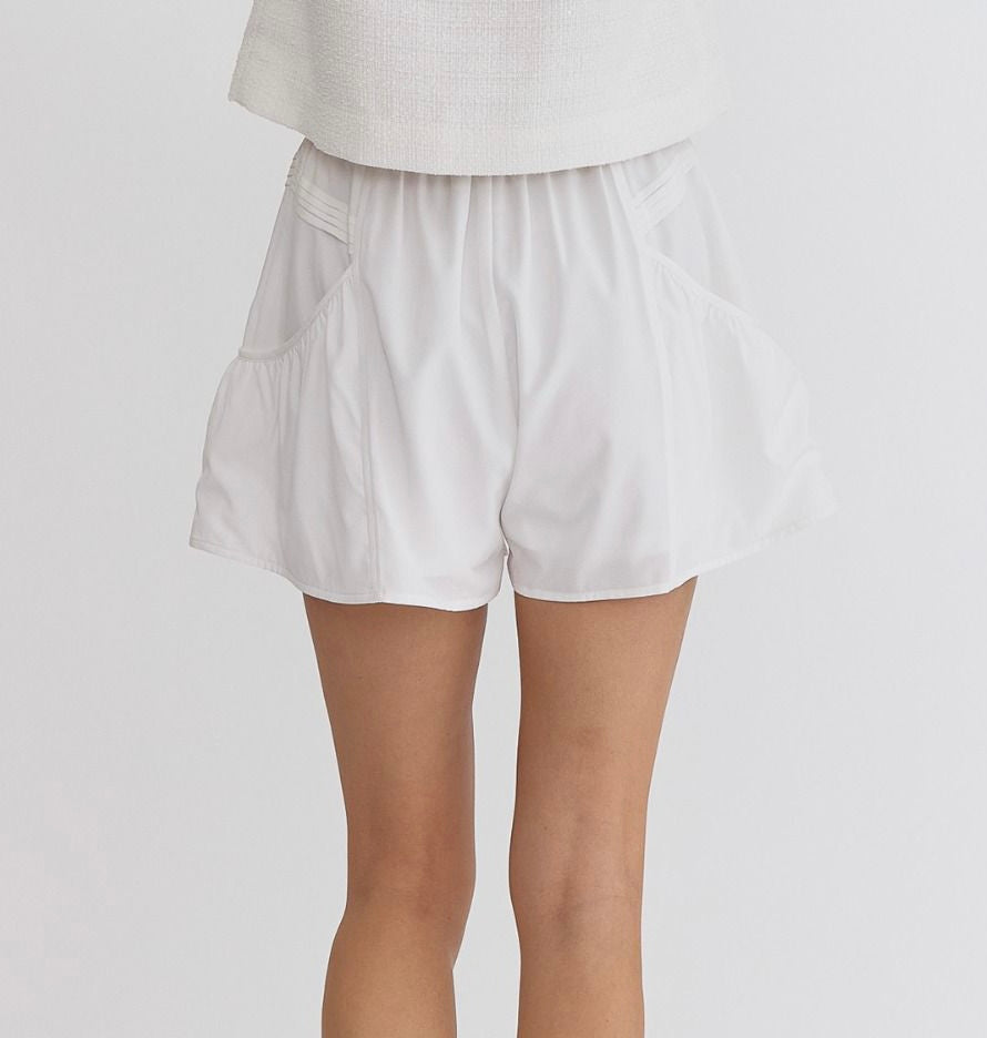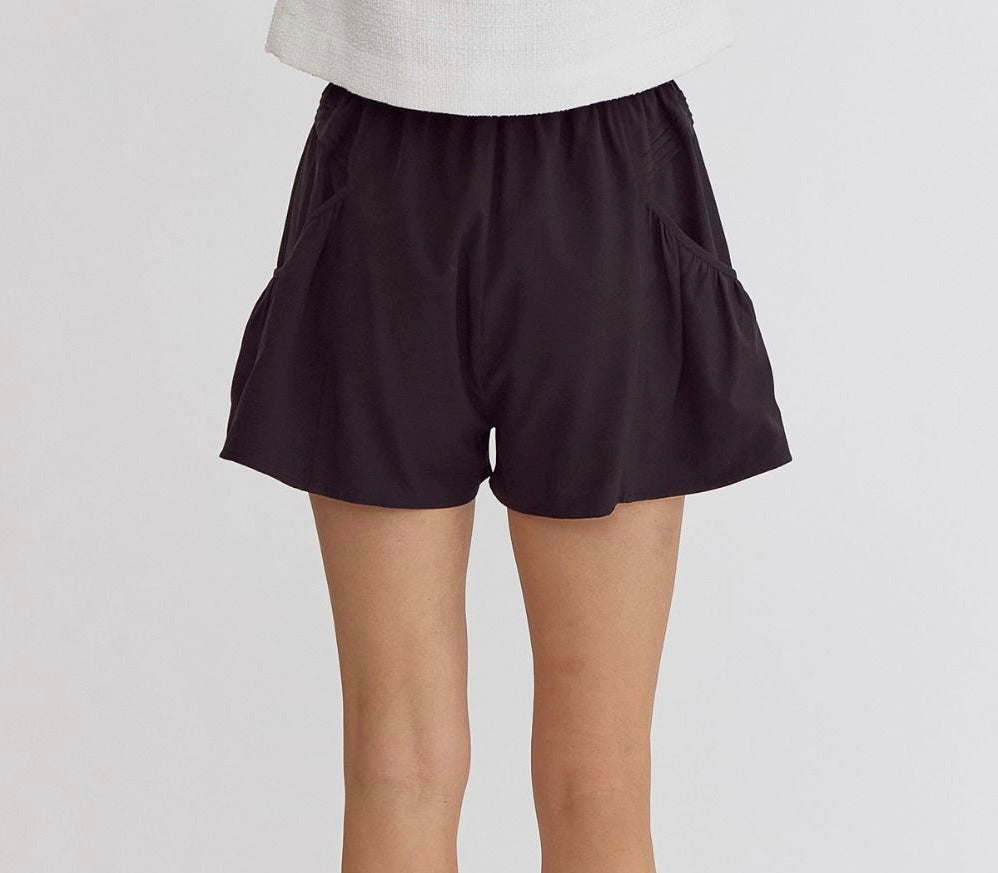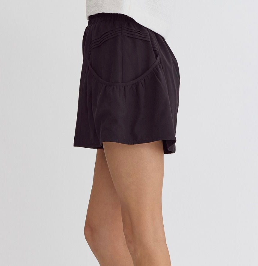 High waisted pleated shorts with elastic waist and side pockets!