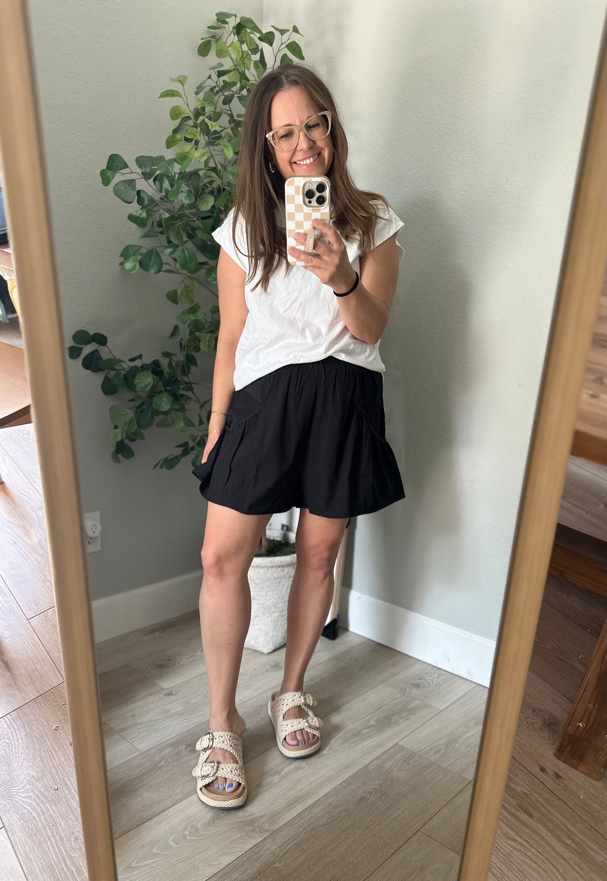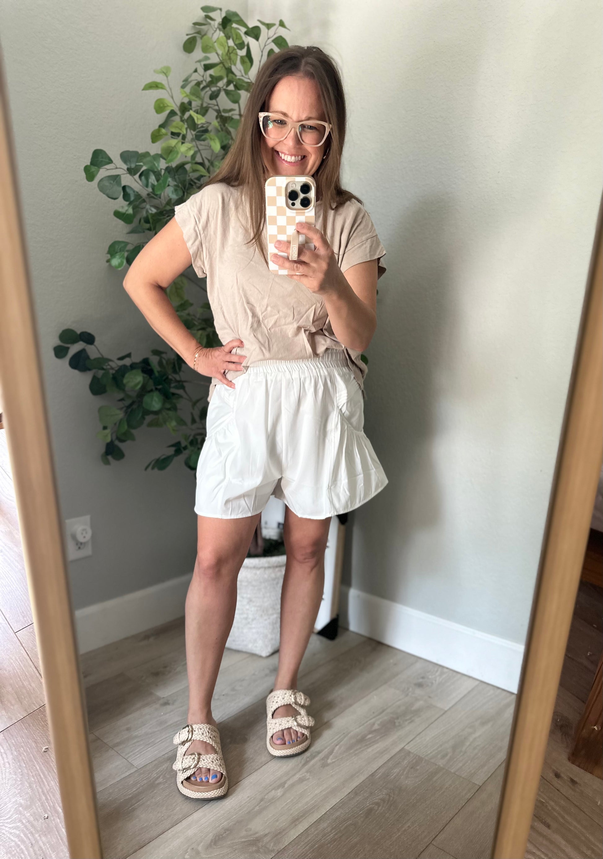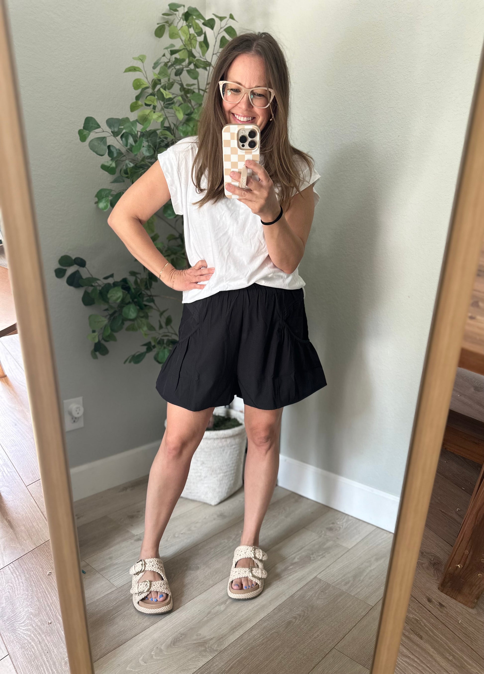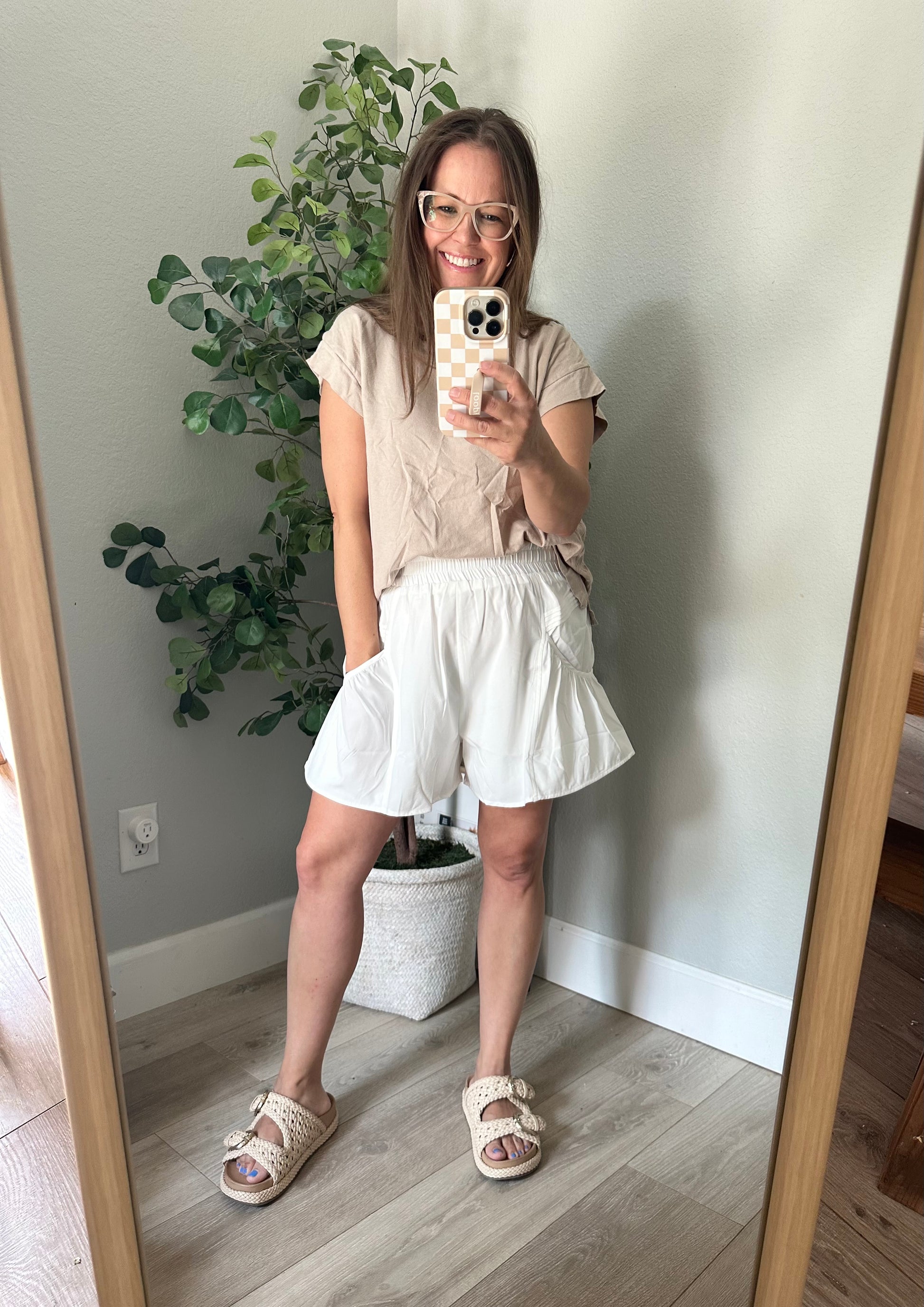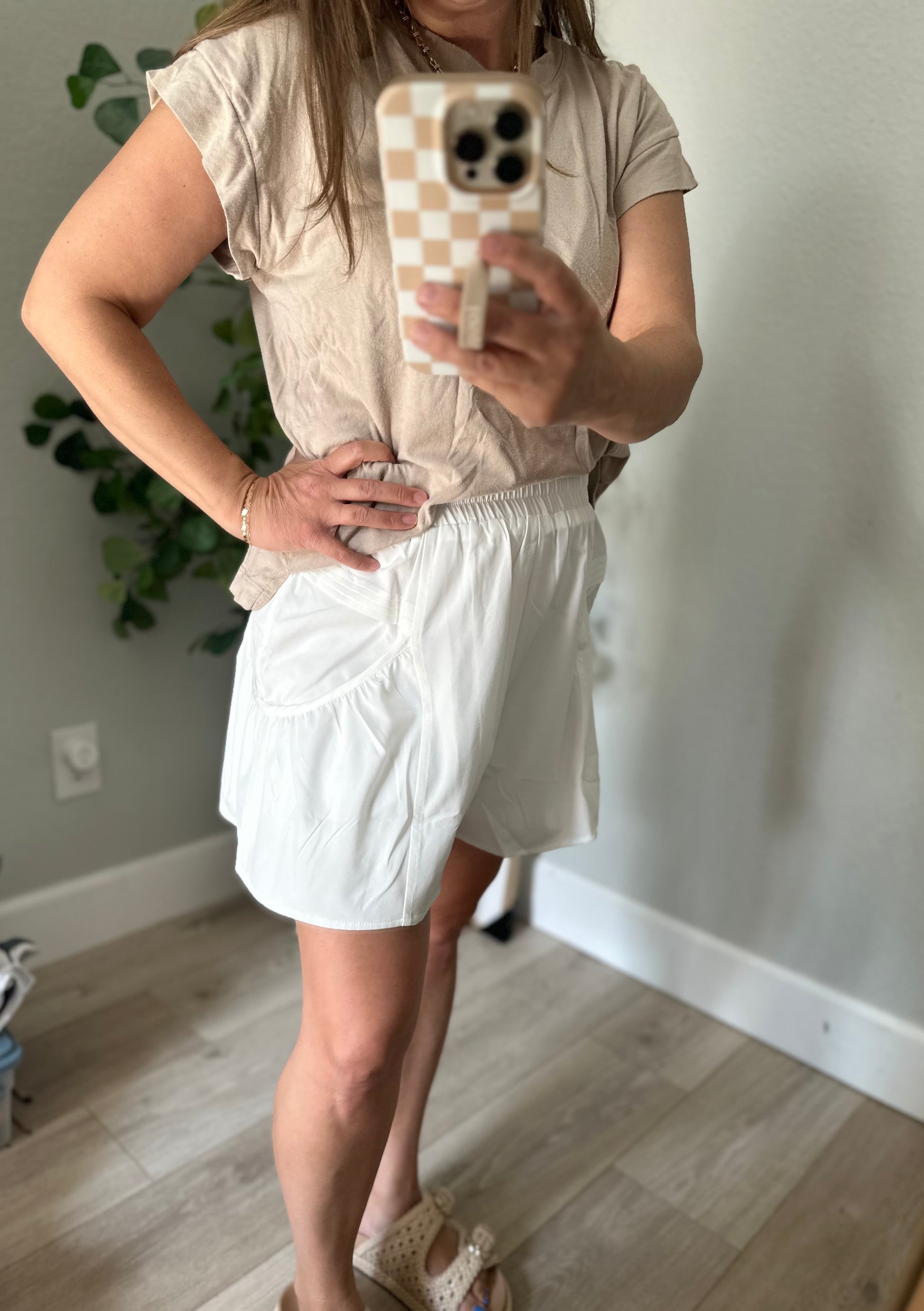 High waisted pleated shorts with elastic waist and side pockets!